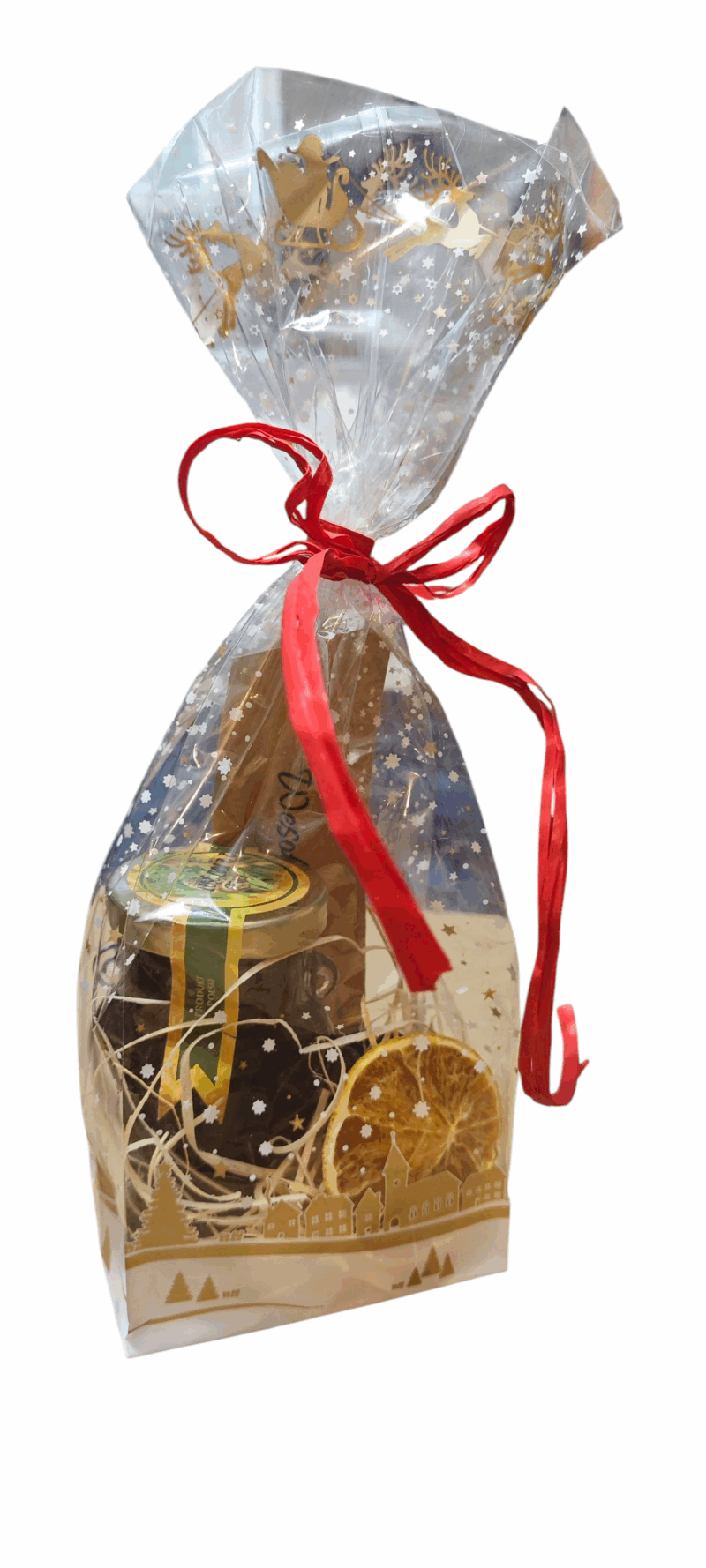 Stylowe opakowanie prezentowe, elegancka folia z motywem świątecznym wypełniona naturalną wełną drzewną . Dzięki temu prezent jest gotowy do wręczenia.