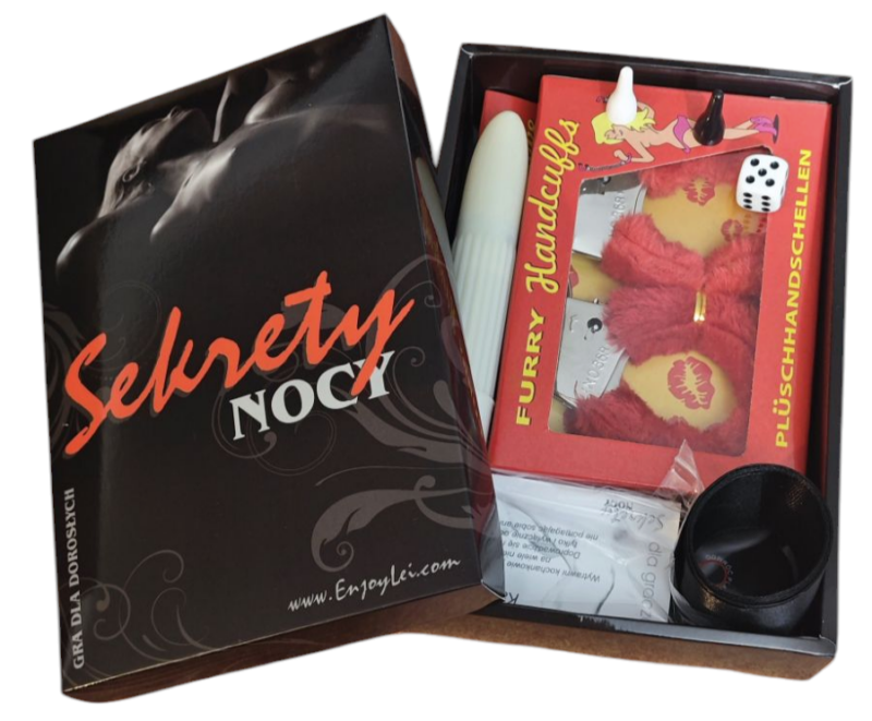 Gra Sekrety Nocy zawierająca m.in kolorowe kajdanki , wibrator, zestaw kart do gry