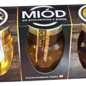 Zestaw trzech miodów w ozdobnych szklanych amforkach (spadziowy, gryczany, akacjowy) 3x140g.