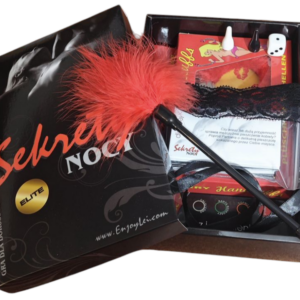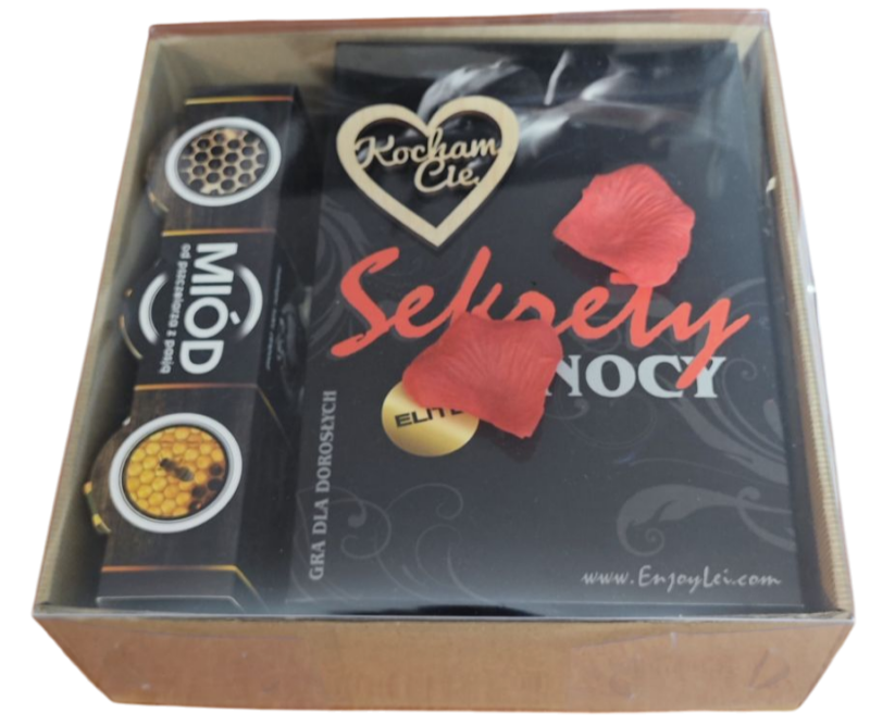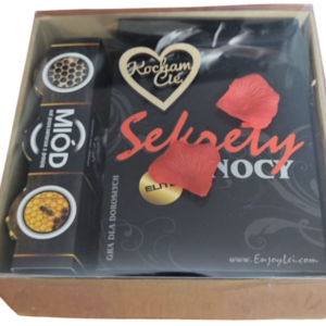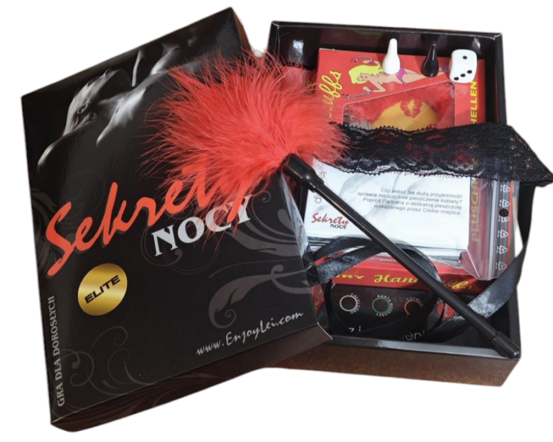 - Gra Sekrety Nocy w wersji Elite zawierająca m.in kolorowe kajdanki , ręcznie szytą koronkową opaskę na oczy, kolorowe piórko